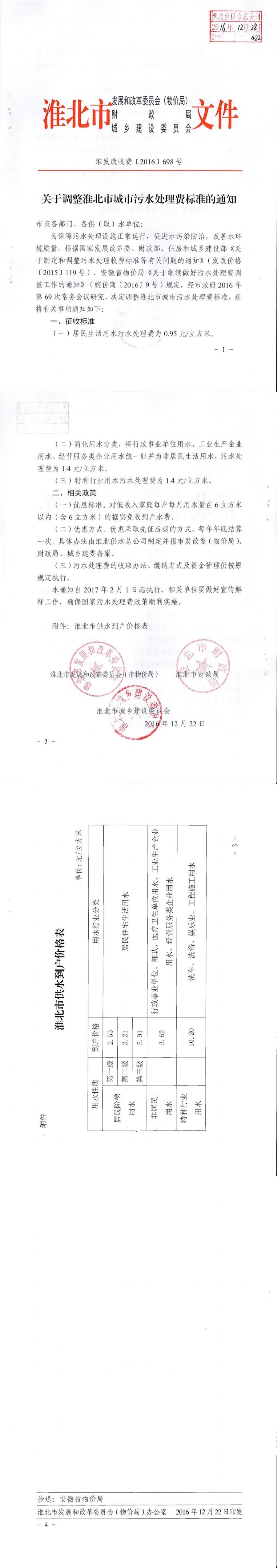 關(guān)于調(diào)整淮北市城市污水處理費標準的通知 淮發(fā)改收費【2016】698號