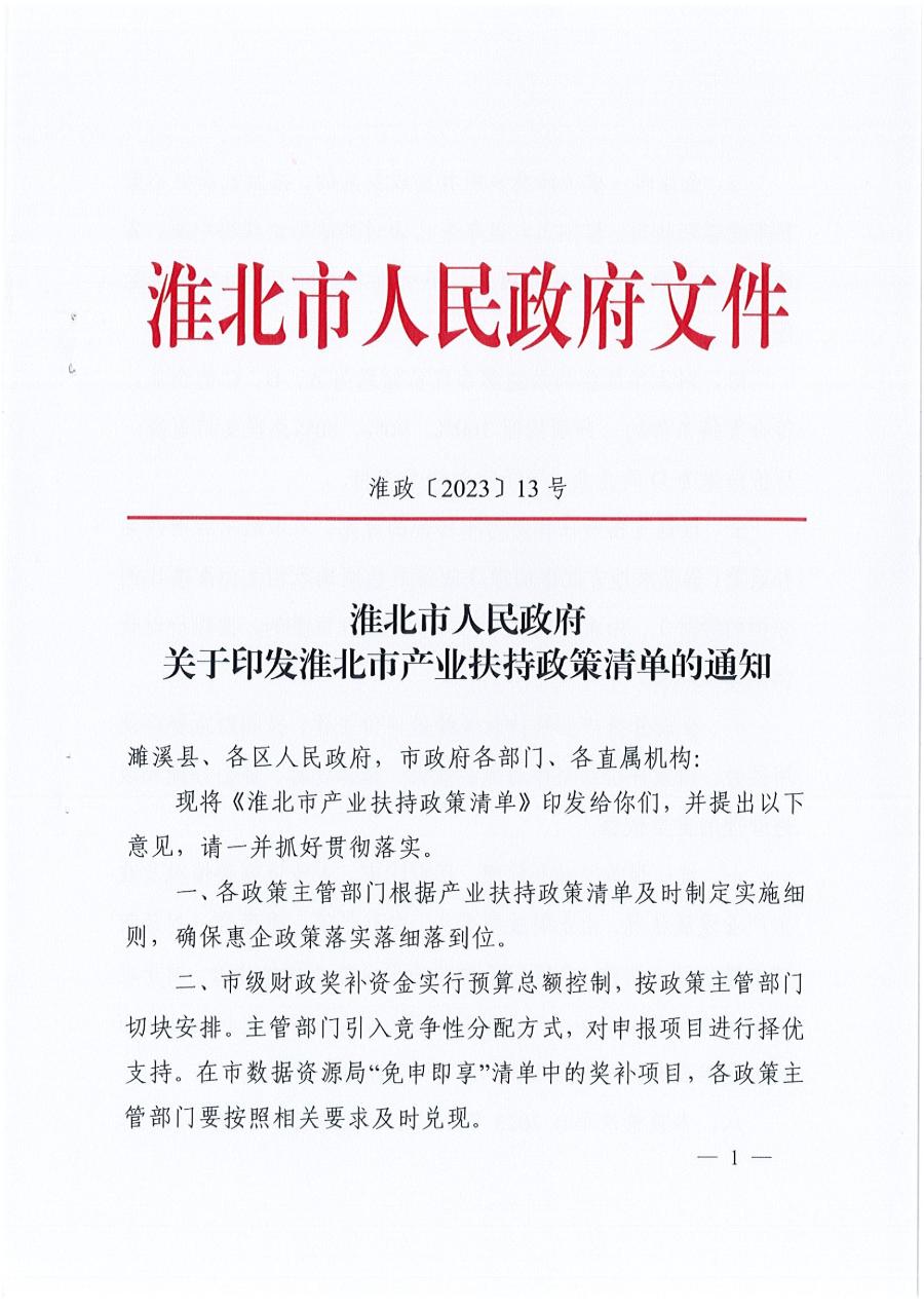 淮北市人民政府關(guān)于印發(fā)淮北市產(chǎn)業(yè)扶持政策清單的通知 淮政【2023】13號