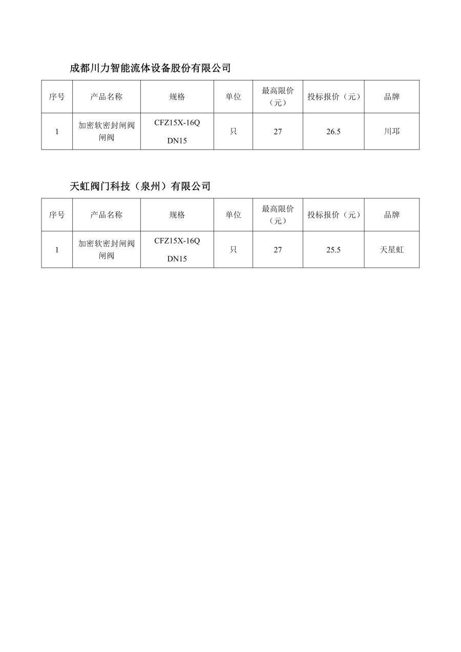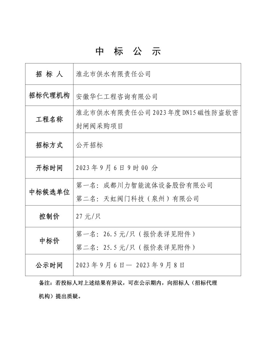 中標(biāo)公示:淮北市供水有限責(zé)任公司2023年度DN15磁性防盜軟密封閘閥采購項目