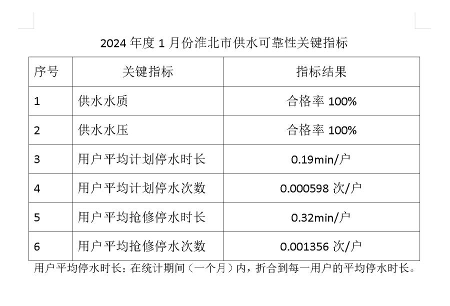 2024年度1月份淮北市供水可靠性關(guān)鍵指標(biāo)
