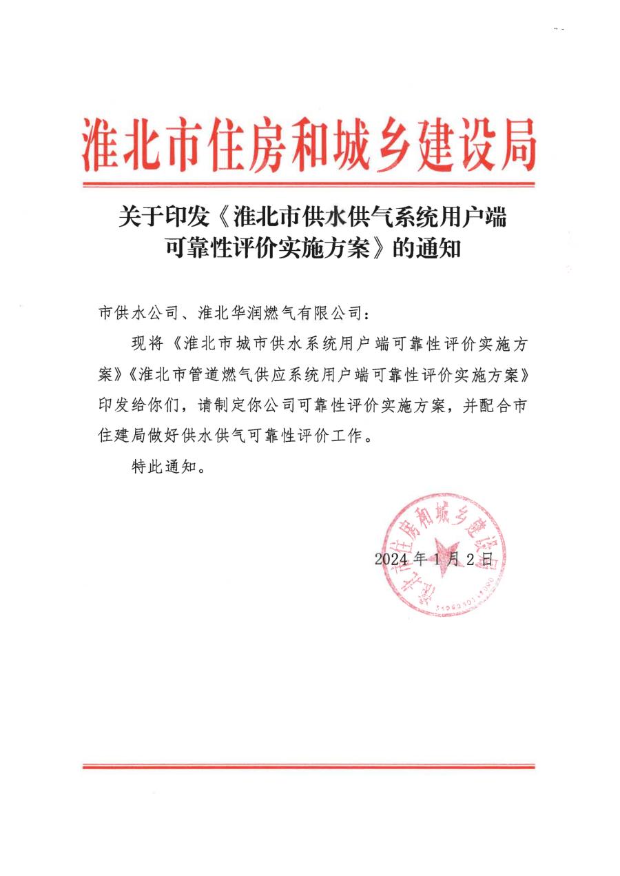 關(guān)于印發(fā)《淮北市供水供氣系統(tǒng)用戶端可靠性評價實施方案》的通知