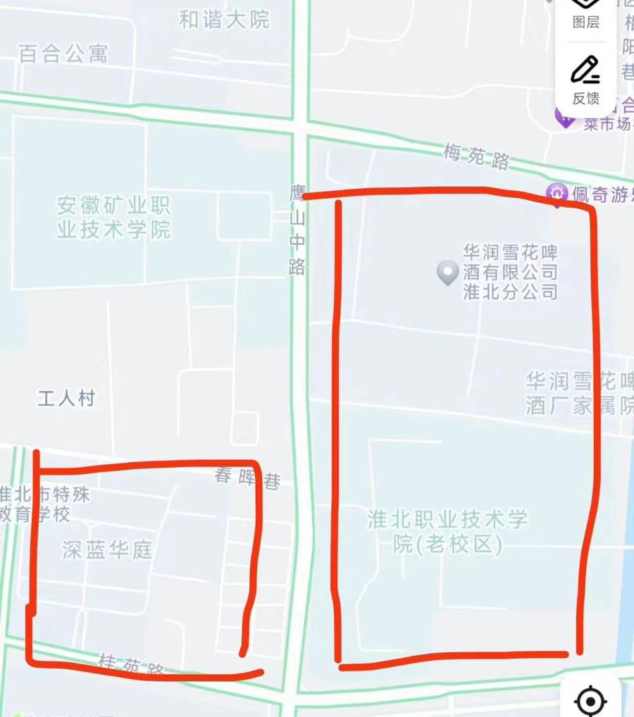 計劃影響范圍:影響深藍華庭,淮北市職業(yè)技術(shù)學(xué)院(老校區(qū)),雪花啤酒廠